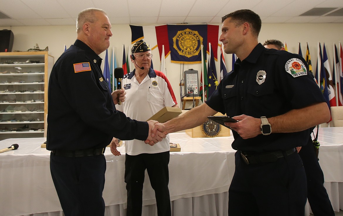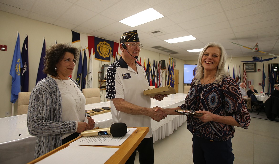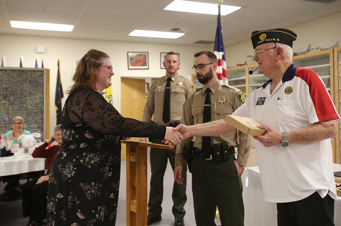 Kootenai County Sheriff's Office Emergency Communications Officer of the Year Janyce Wadsworth shakes Post Falls American Legion Post 143 Commander Jim Culpepper's hand Saturday night as she receives her award. Wadsworth, a training coordinator and supervisor, worked over 840 hours of overtime just in the last year.ARTICLES BY DEVIN WEEKS