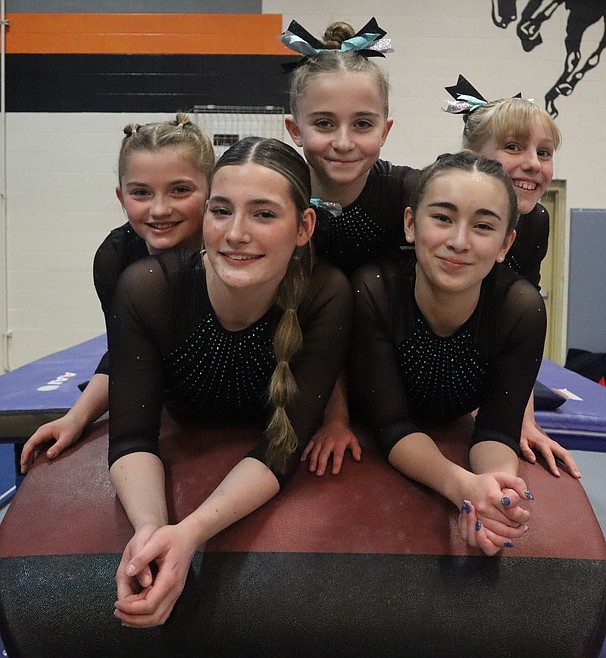 Courtesy photo GEMS Athletic Center Platinum Team placed 2nd overall in the Snowglobe Classic gymnastics competition March 7-9 at The Courts in Post Falls. From left are Ensley Vucinich, Macee Caudle, Olivia Kiser, Saydee Mathews and Keeley Howard.