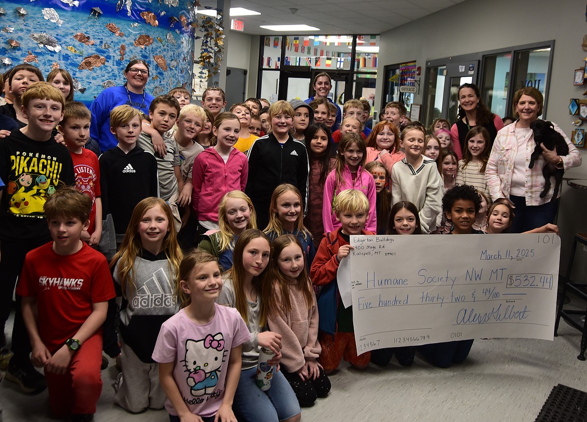 On Tuesday, more than 75 third graders piled into the school entryway to present the Humane Society with a handmade oversized check. As the chattering students rounded the hallway their faces lit up with smiles, some clasping their hands in front of their faces, as they saw Humane Society of Northwest Montana Executive Director Stacie DaBolt and Shelter Manager Noelle Almrud holding two puppies, Pluto and Hades, the last of their litter available for adoption.