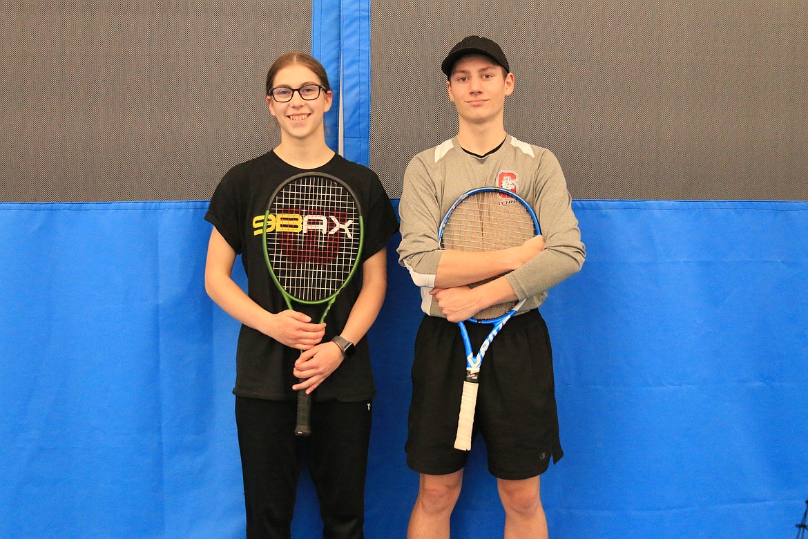 Full caption: Bonners Ferry High freshman Kaitlyn Becker, left, and junior Daniel Woelfle, right, are some of the first Badgers to compete in high school tennis in a number of decades. The duo will compete with Sandpoint's junior varsity team throughout the regular season, and in the postseason, will represent Bonners Ferry at the 4A District 1-2 Championships and potentially the 4A State Championship. Sandpoint High head coach Kent Anderson said they're the first two from Boundary County that he has coached in his 17 years as head coach. Woelfle, who now spends a lot of time at the new James E. Russell Sports Center in Sandpoint, started playing the sport last winter, practicing indoors at Valley View Elementary school. He then really ramped up his training in the summer, hitting hundreds of serves per day. After falling in love with the sport, he now has aspirations of even playing beyond high school someday. As for Becker, both of her parents played in all their years of high school and introduced her to the sport. She's been playing tennis for a couple of years now and is looking forward to the remainder of the season.