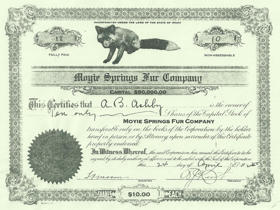 This certificate for 10 shares in the Moyie Springs Fur Company was sold to A.B. Ashby on April 24, 1925.