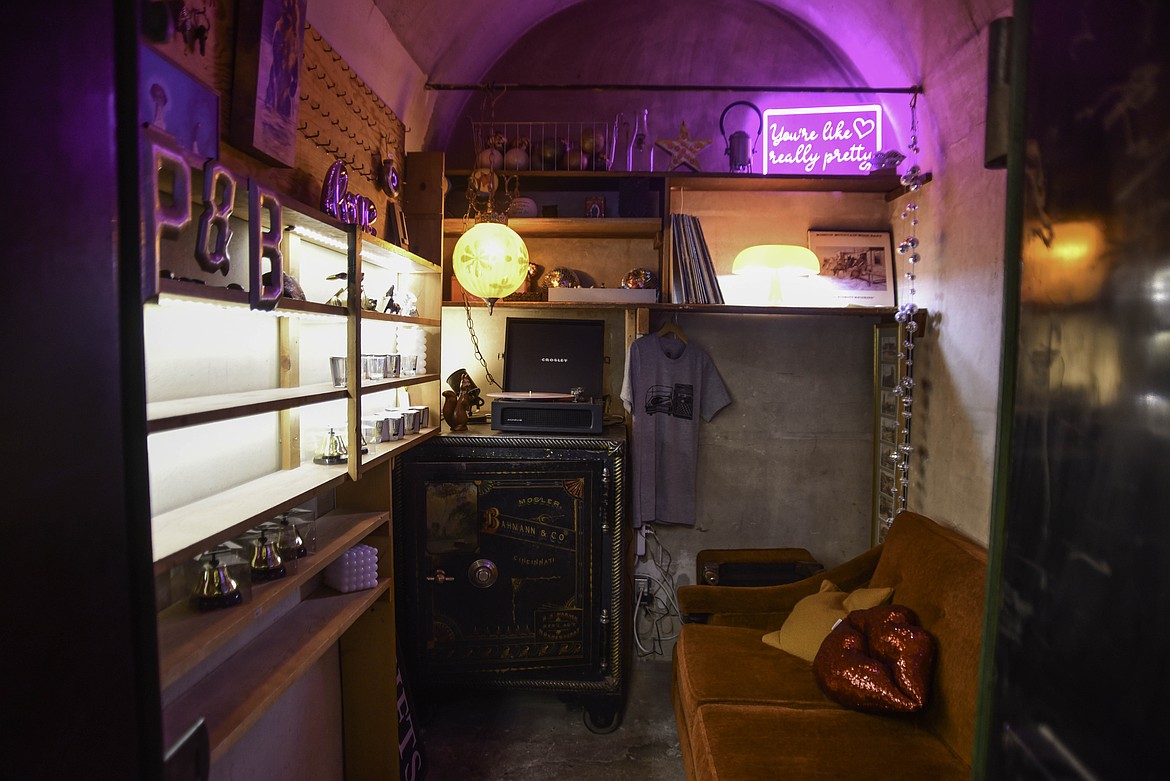 The original displays from Wheeler Jewelry are still in the store, some still used for jewelry today. The space also features a vault in the corner, which Kornick and Waterman have turned into a funky sale room with a record player and various records.