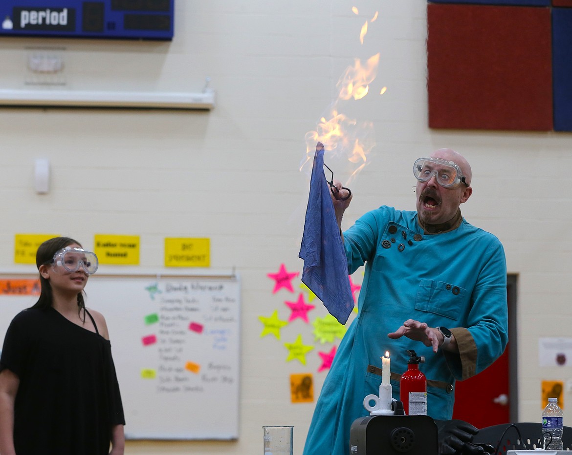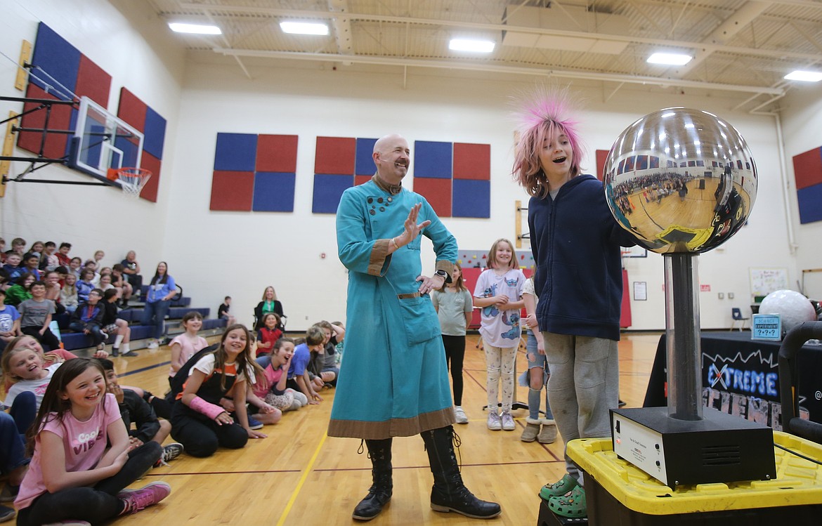 Fourth grader Kellin Dunnagan Latuseck participates in an experiment Thursday afternoon during an Extreme Science assembly with science wizard David Hagerman at Bryan Elementary.ARTICLES BY DEVIN WEEKS
