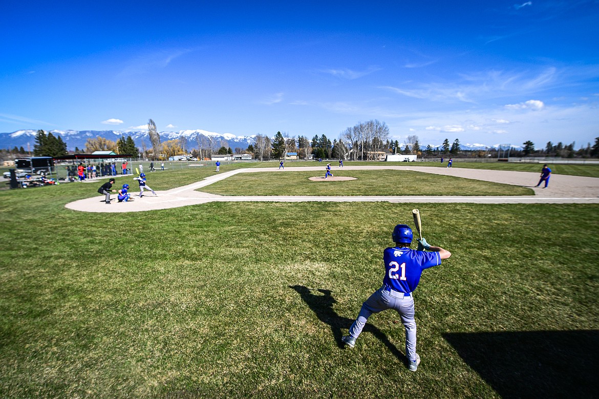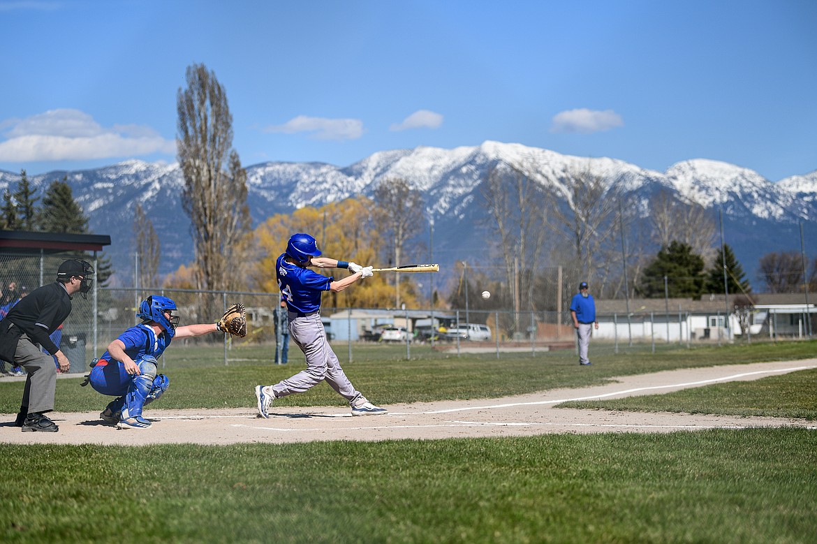 Columbia Falls' Jory Hill (14) drives in a run against Bigfork at ABS Park in Evergreen on Tuesday, April 15. (Casey Kreider/Daily Inter Lake)