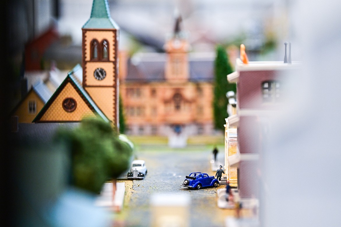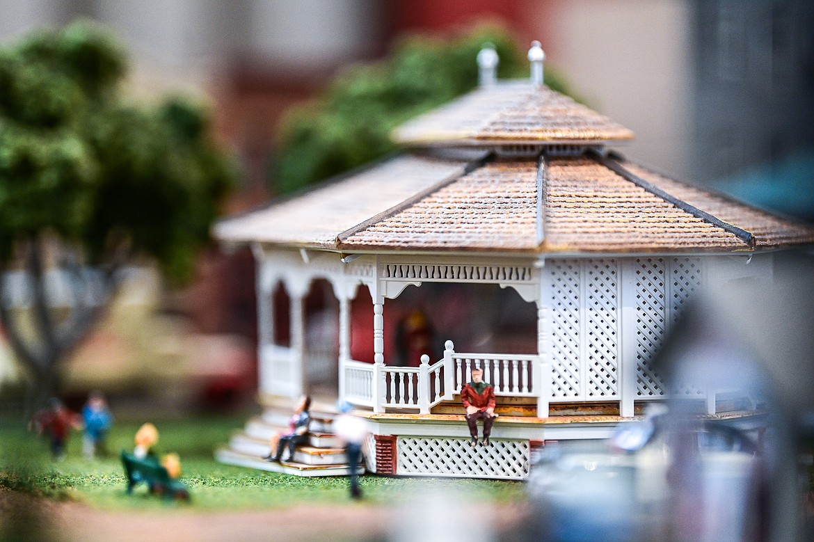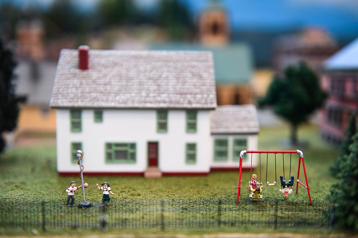 Looking through the glass surrounding the display, there’s a whole story to uncover as viewers can spot a woman hanging laundry out to dry and children playing in a park. There are cars driving along the roadways and a man is hard at work finishing the roof of a red house.