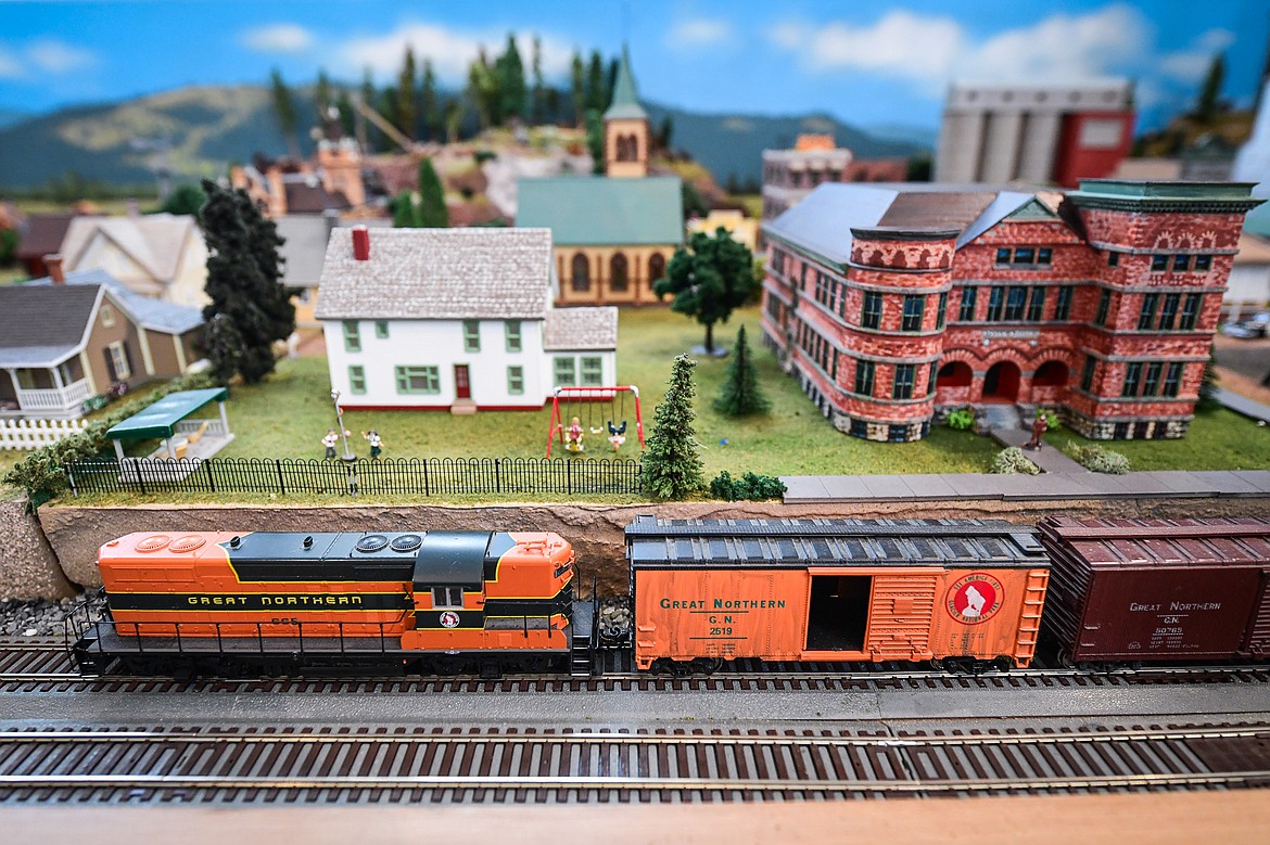 A red button at the center of the model display allows visitors to activate the trains watching them circle around the town. The whistle of the Great Northern Railway train announces its arrival.