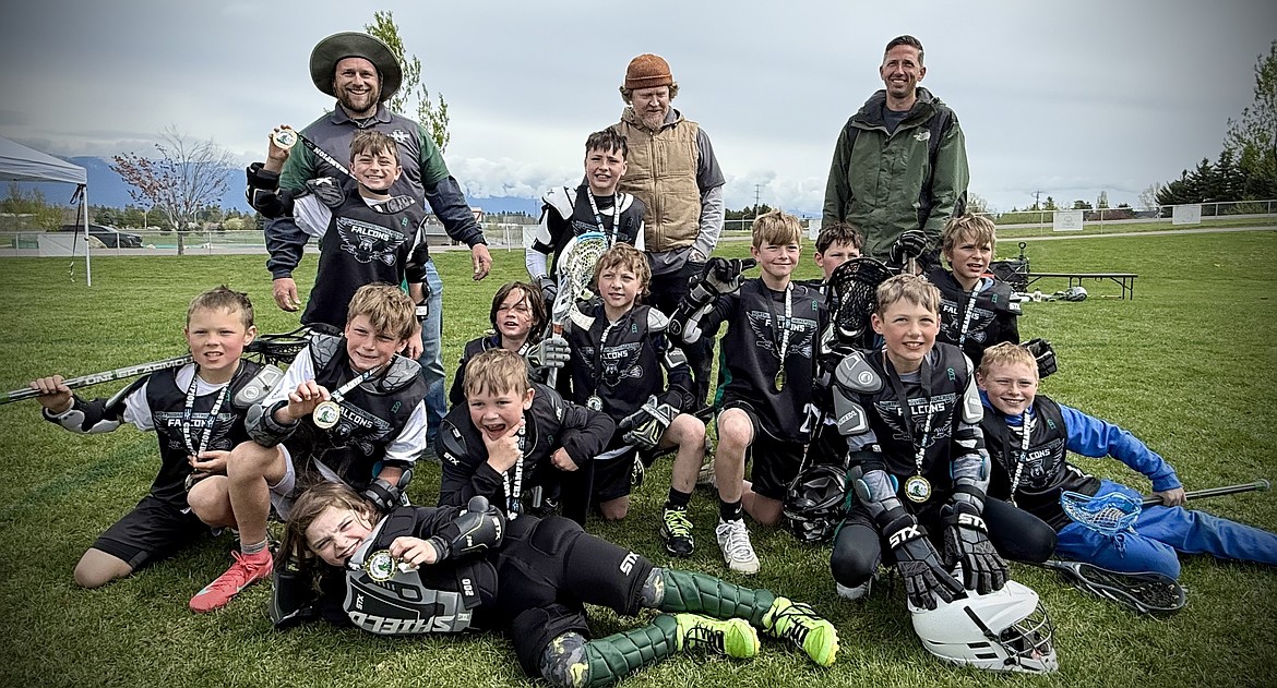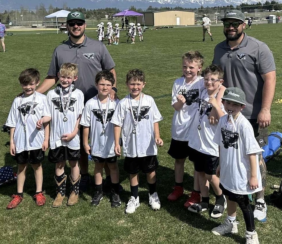 Courtesy photo The North Idaho Youth Lacrosse 1/2 Grade Falcons took first place at the Northwest Shootout May 3-4 in Kalispell, Mont. In the front row from left are Kai Cullen, Owen RaaeNielson, Summit Turrell, Anderson Perkins, Jett Tanner, Henry Dodgion and Van Montgomery; and rear, coaches Evan Perkins and Chris Montgomery.