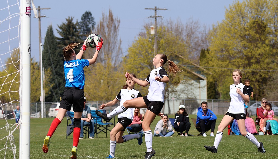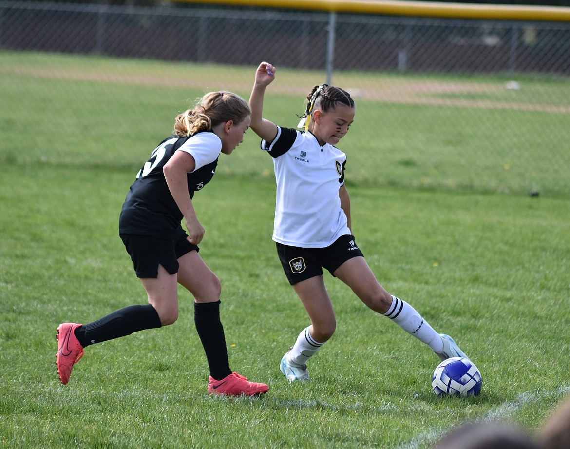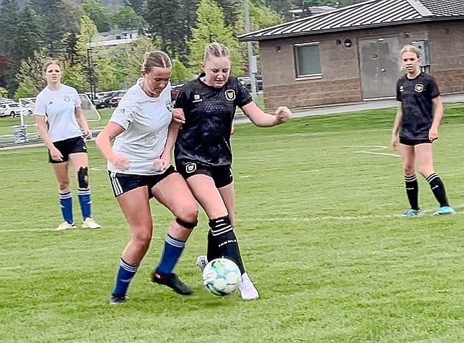 Photo by JULIE SPEELMAN The Sting 11 Girls soccer team beat the Spokane Scotties 3-0 last Saturday at the Dwight Merkel Sports Complex in Spokane. Alex Keating, Elle Sousley and Brinlee Plumb each scored a goal for the Sting. Pictured in black is Kenzie Rix of the Sting, vying for the ball. At right is teammate Evelyn Haycraft.