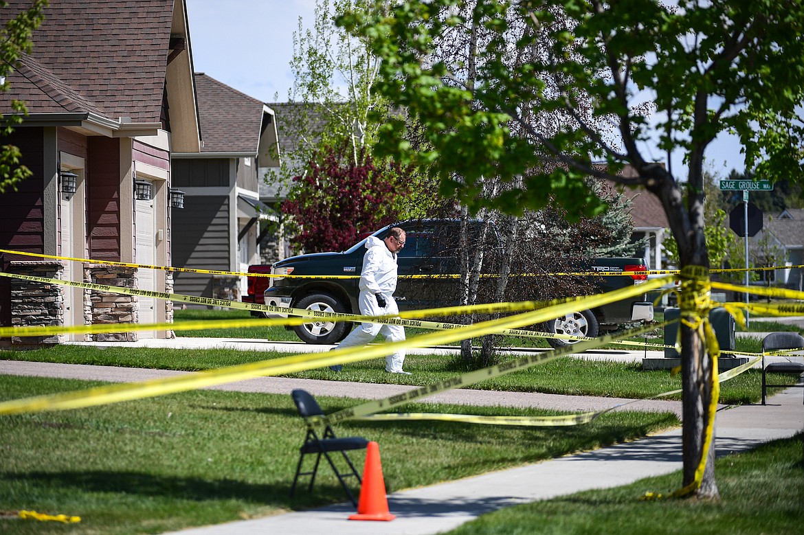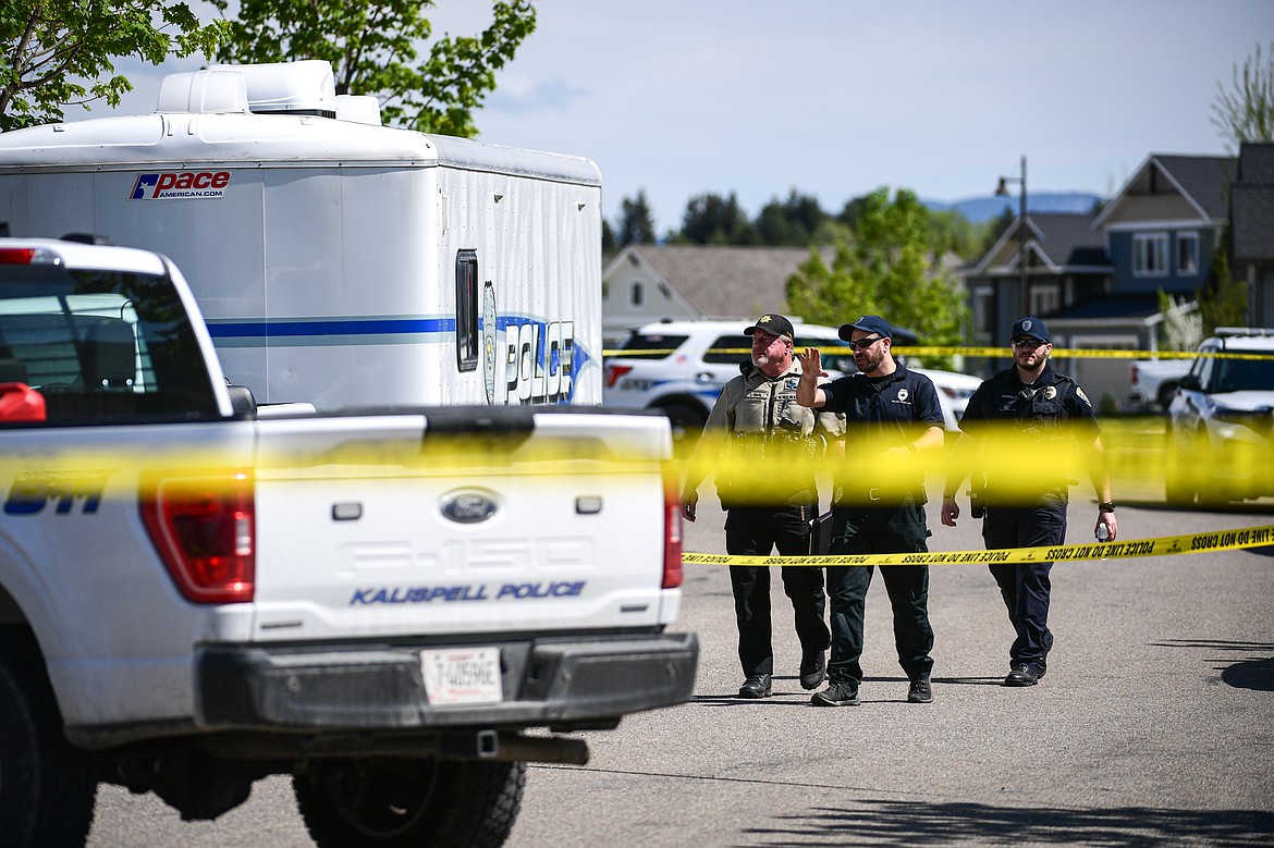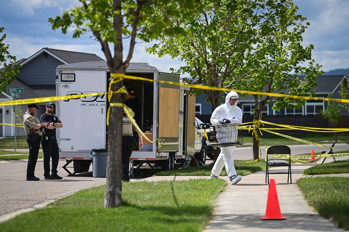Members of Kalispell Police Department and Flathead County Sheriff's Office work at the scene of a murder-suicide where four people died on Werner Peak Trail in Silverbrook Estates in Kalispell on Sunday, May 11. (Casey Kreider/Daily Inter Lake)