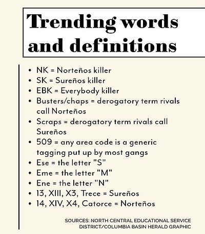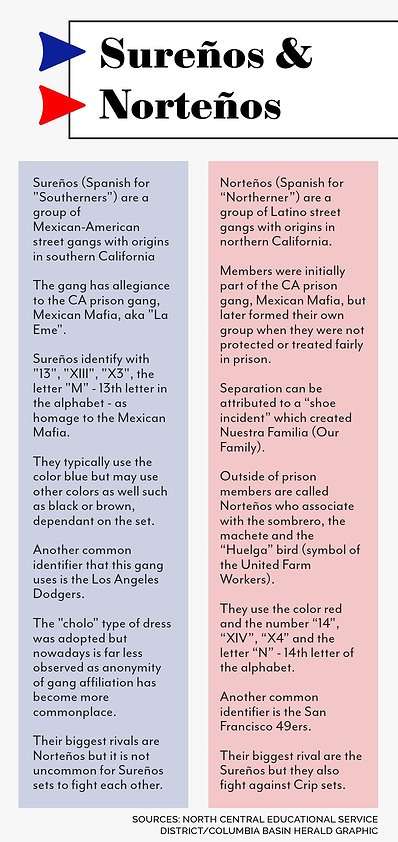The Sureños and Norteños are two prominent street gang factions in Grant County, she said, primarily known for their rivalry and association with respective prison gangs. Sureños members are affiliated with the Mexican Mafia, La Eme. For the Sureños, blue and black, the letter “M”, the number 13 and LA Dodgers are examples commonly found to represent themselves. Norteños are aligned with the Nuestra Familia. For the Norteños, the color red, the number 14, Norte, the letter N, the huelga bird, and NorCal references are common symbols representing the group.