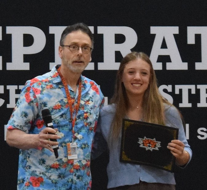 English teachers Don Hendrixson and Maya Allsopp presented the English awards together, awarding Erika Morford with the Outstanding Senior Award and Audreyah Gray with the Grit Award.