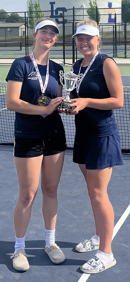 Courtesy photo Lydia Lehosit, left, and Claire Leahy of Coeur d'Alene Charter Academy won their second straight girls doubles district title at the 4A District 1-2 tournament Saturday in Lewiston.