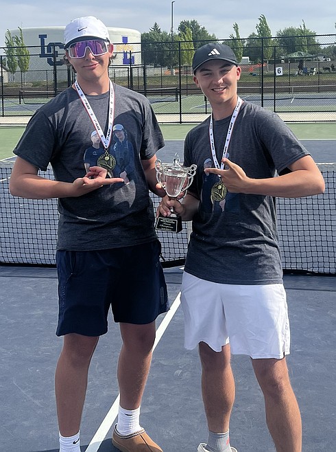Courtesy photo Owen Sharp, left, and Tate Burkholder of Coeur d'Alene Charter Academy won their third straight boys doubles district title at the 4A District 1-2 tournament Saturday in Lewiston.
