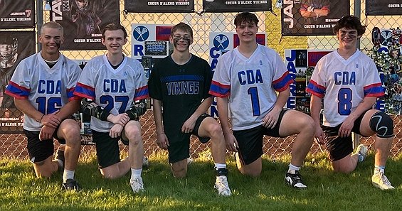 Courtesy photo The Coeur d'Alene High lacrosse team celebrated senior night with an 11-3 victory over Immaculate Conception Academy of Post Falls last Wednesday at Coeur d'Alene High. From left are Viking seniors Tavin Kidd, Reed Garrett, Carson Atkinson, Jarrett Dennis and Clive Hobbs. Atkinson led Coeur d'Alene with four goals, Gavin Lucas had three, Brayden Osterdock had two goals and an assist, Hobbs and Gunnar Smither had two goals each, Brody Wickham and Sheen Broncheau had one goal each, and Ron Kincaid had an assist. Mason Hector had two saves.Coeur d'Alene finished the season with a 3-11 record.