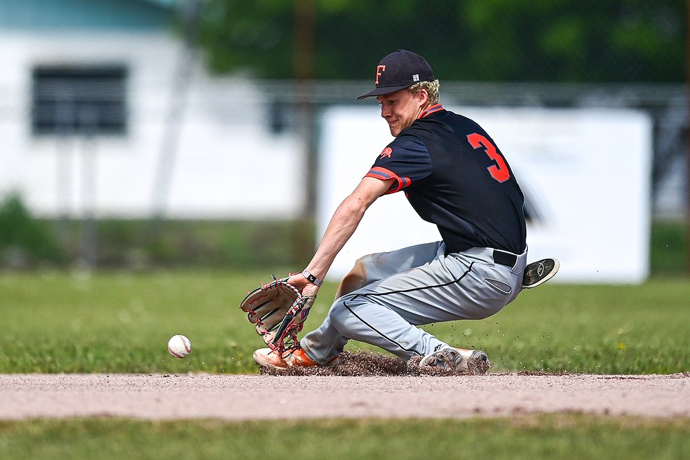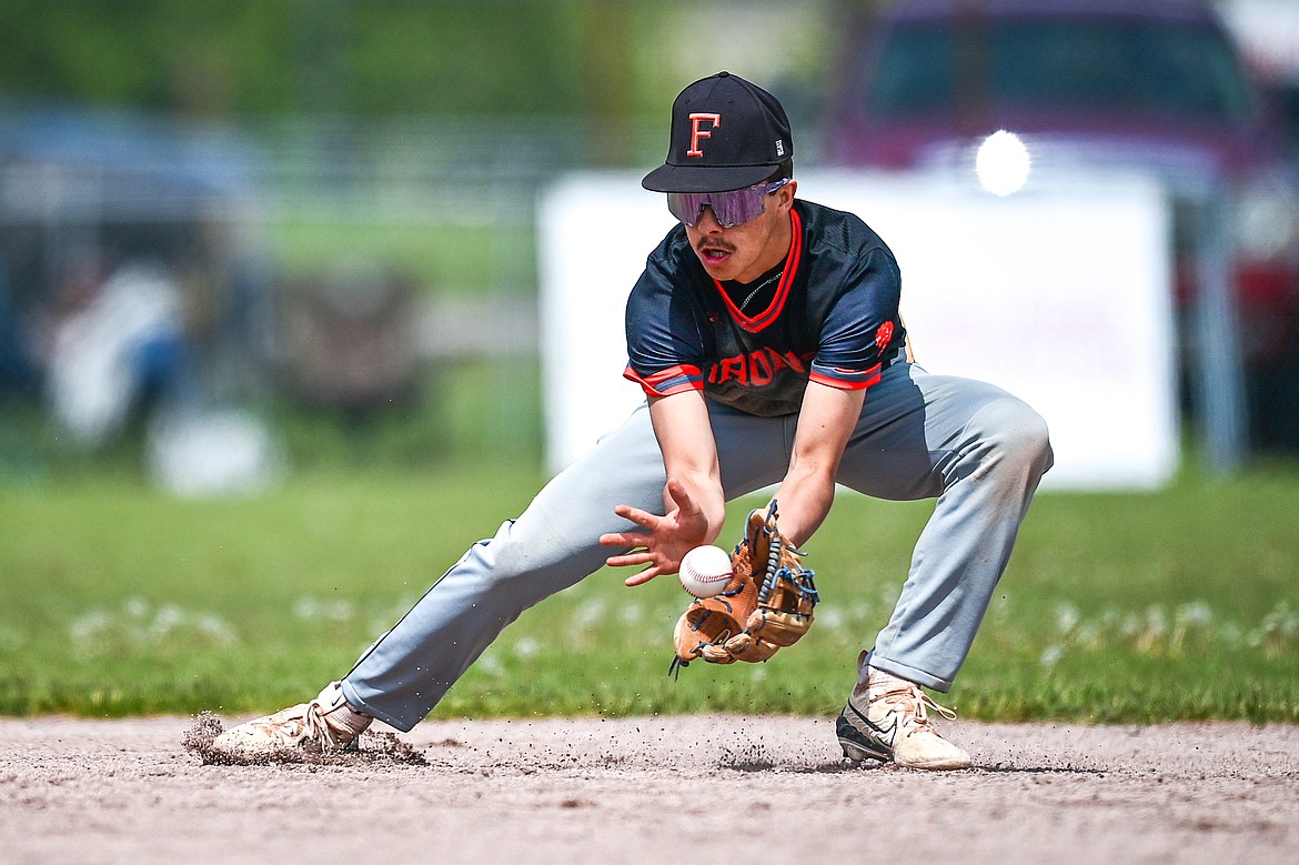 Frenchtown shortstop Jordan Warner (3) backhands a ground ball against Columbia Falls in the Sapa-Johnsrud Invitational on Saturday, May 17. (Casey Kreider/Daily Inter Lake)Casey Kreider
