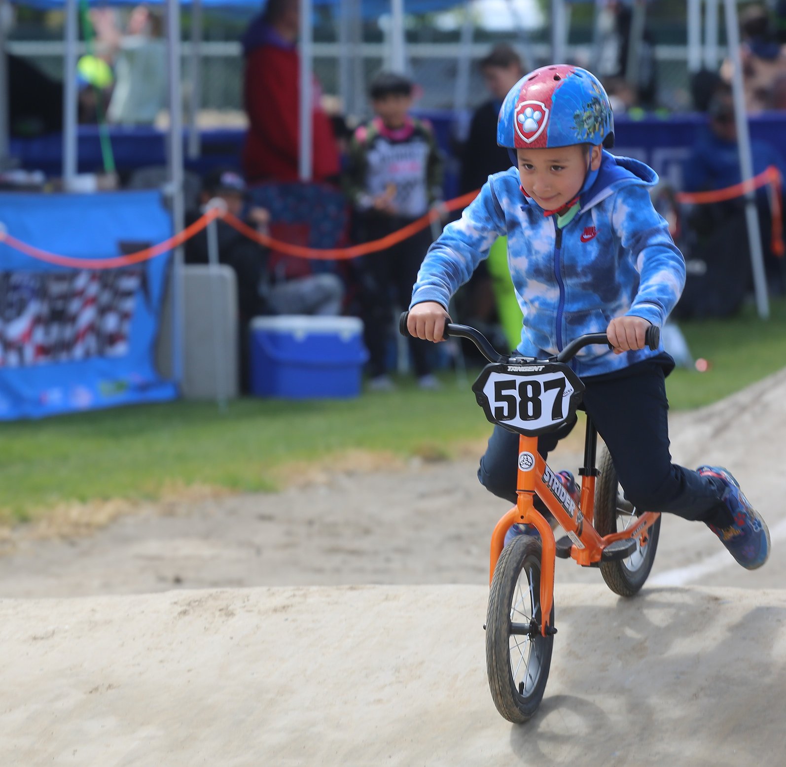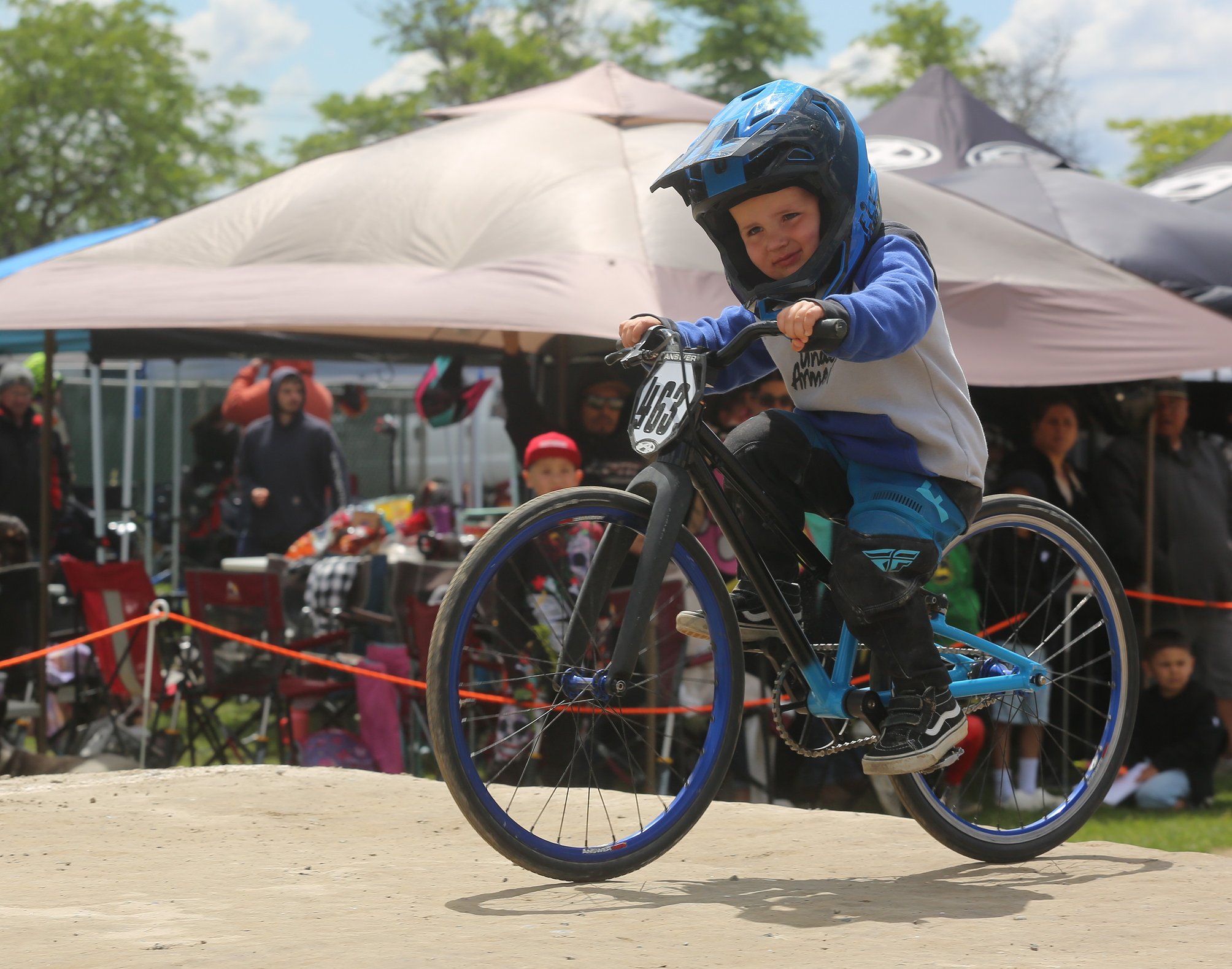 Riders as young as 3 years old rode on a smaller portion of the track for their own races. Parents lined up along the end of the track and rooted their kids on. Some would stop at the top of a small incline and wave to the crowd watching and others bought into the competition, moving as fast as they could.