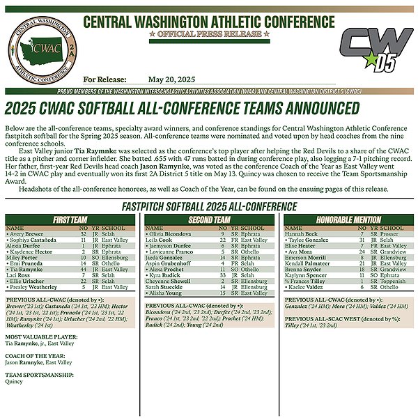 COLUMBIA BASIN – The Central Athletic Conference has announced their All-Conference teams for fastpitch softball. Basin softball saw two teams represented across the first and second teams.