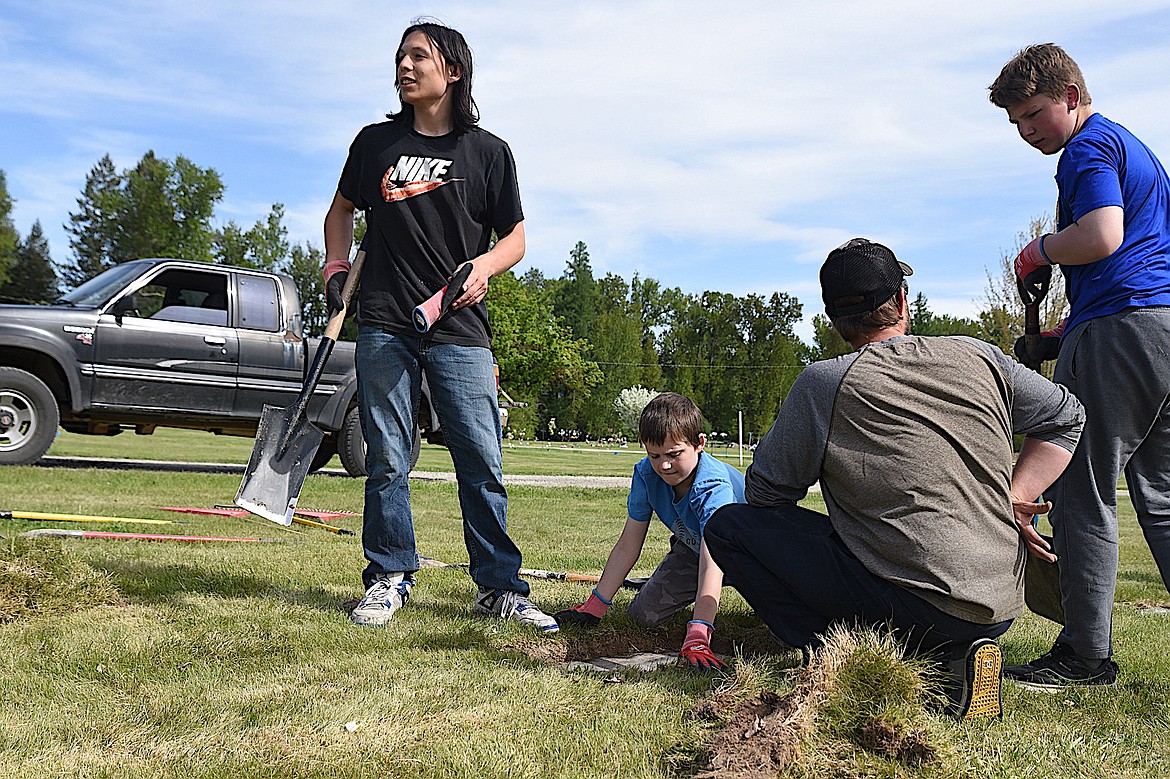Eagle Scout candidate Dominic Thom, left, and Libby Boy Scout Troop 1971 members work at a grave site in the city of Libby Cemetary Friday, May 9, 2025. Thom's Eagle Scout project was to refurbish headstones that had sunk lower than ground level over the years. (Scott Shindledecker/The Western News)ARTICLES BY SCOTT SHINDLEDECKER
