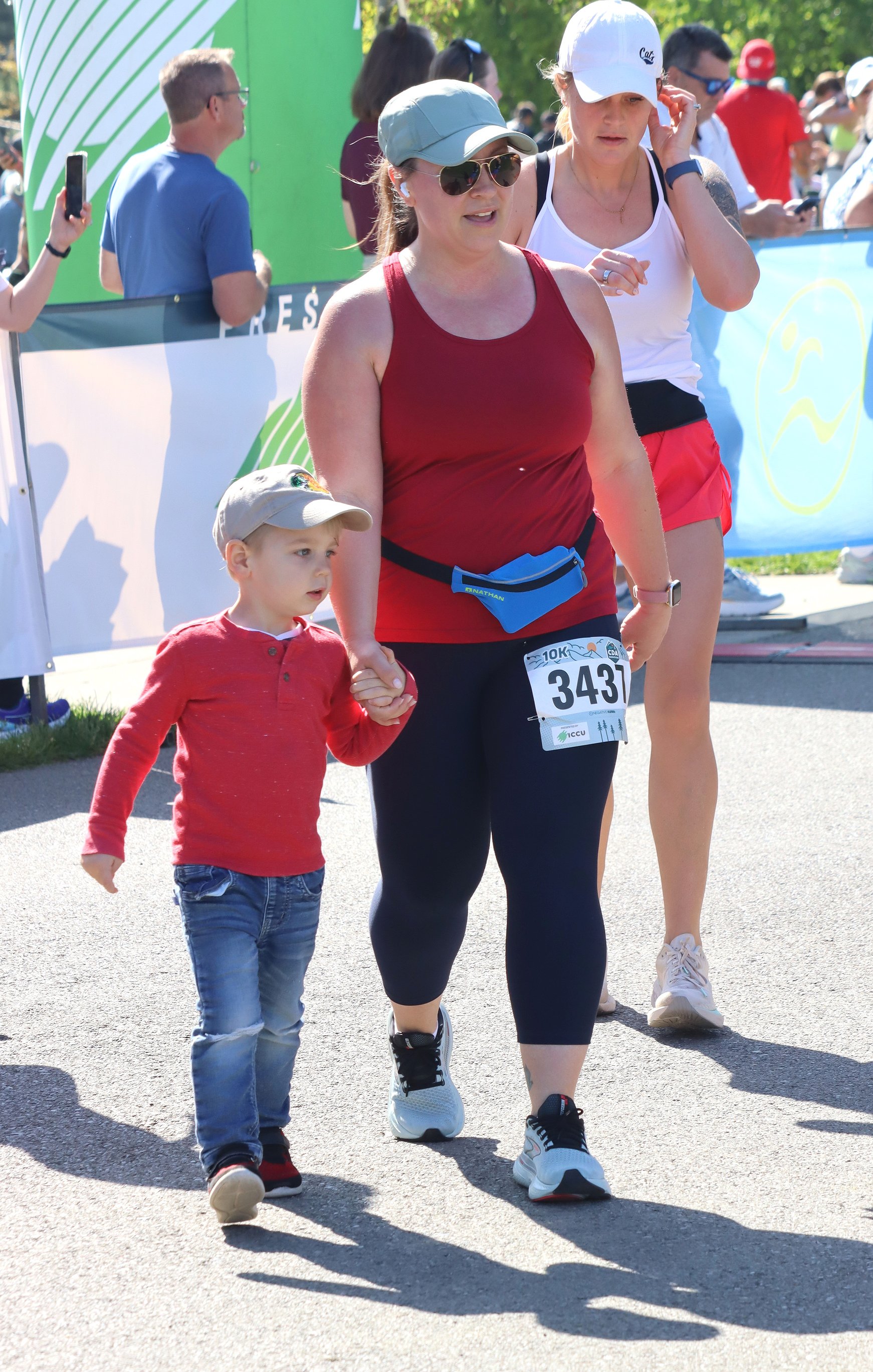 Jaylene Crosby of Coeur d’Alene was joined by son Thomas, 3, just before finishing the 10K, and they held hands.