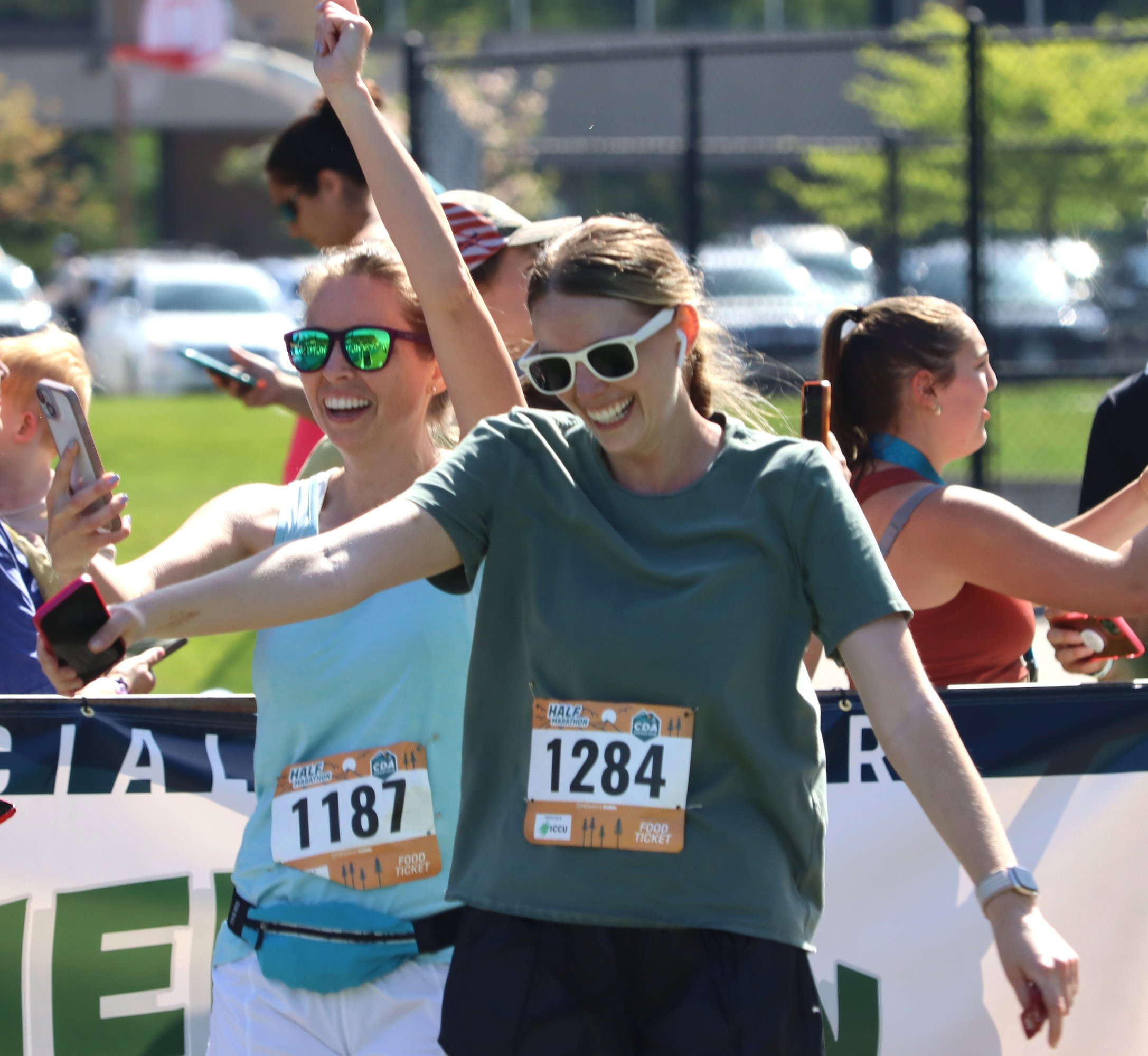 Sisters Tiffany Pettey of Spokane and Lindsey Everill of South Jordan, Utah, raised their hands in triumph as they completed the half in 2:48.