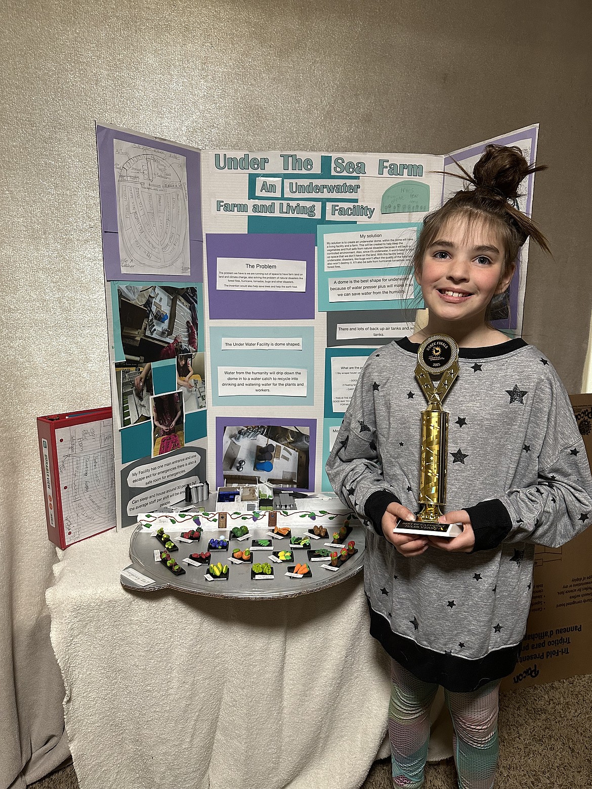 “My invention is a dome I created under water to make a farm with a living facility to help make room for farms, since we are running out of room on land and to keep plants safe from natural disasters like hurricanes, forest fires, tornadoes, bugs and more,” she said.
