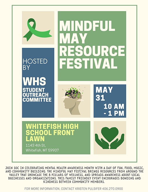 The Mindful May Festival is set for this Saturday, May 31, from 10 a.m. to 1 p.m, on the Whitefish High School front lawn. The free, family-friendly inaugural event will have local businesses participating as wellness-related vendors, complete with live music and a food truck.