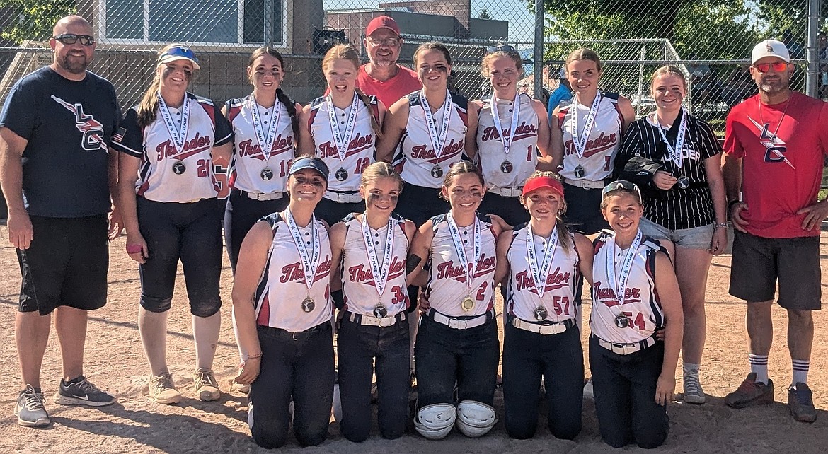 Courtesy photo The Lake City Thunder 14U softball team went undefeated (6-0) last weekend to win the 11-team Lake City Early Bird Tournament in Post Falls, putting up over 80 runs, posting a team batting average of .497, and limiting the other team to a .183 batting average in their first tournament of the season. In the front row from left are Ollie Dudley, Shasta Ackerman, Ella Ferguson, Tessa Lovell and Avah Gonzales; back row from left, assistant coach Adam Gonzales, Savanah Stevens, Katie Nave, Sophie Wasley, Raegan Masters, Reese Vanek, Addie Lisenbe and assistant coach Rich Dudley; and rear, head coach Dwayne Curry.