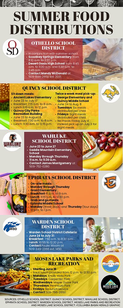 Othello School District will provide their summer meals alongside the summer school program June 30 to July 25. Summer school at Scootney Springs Elementary for grades K-8 will be from 8:10 a.m. to 2:30 p.m. and Grades 9-12 will be at Desert Oasis High School with a morning session from 8:45 to 11:30 a.m. and a night session from noon to 2:45 p.m.