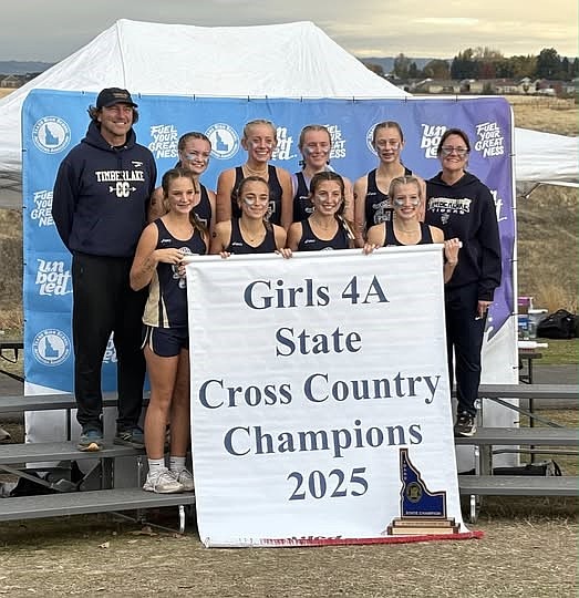 Courtesy photo The Timberlake girls cross country team won the state 4A title on Saturday at Lewiston Orchards, the program’s first since 2011. In the front row from left are Naomi Dirks, Kenzie Jezek, Addisen Berg and Emily Wright. In the back row from left are head coach Shawn Lawler, Malia Miller, Lola Eggleston, Vanessa McLachlan, Kayla Hyle and assistant coach Jennifer Wenstrom.