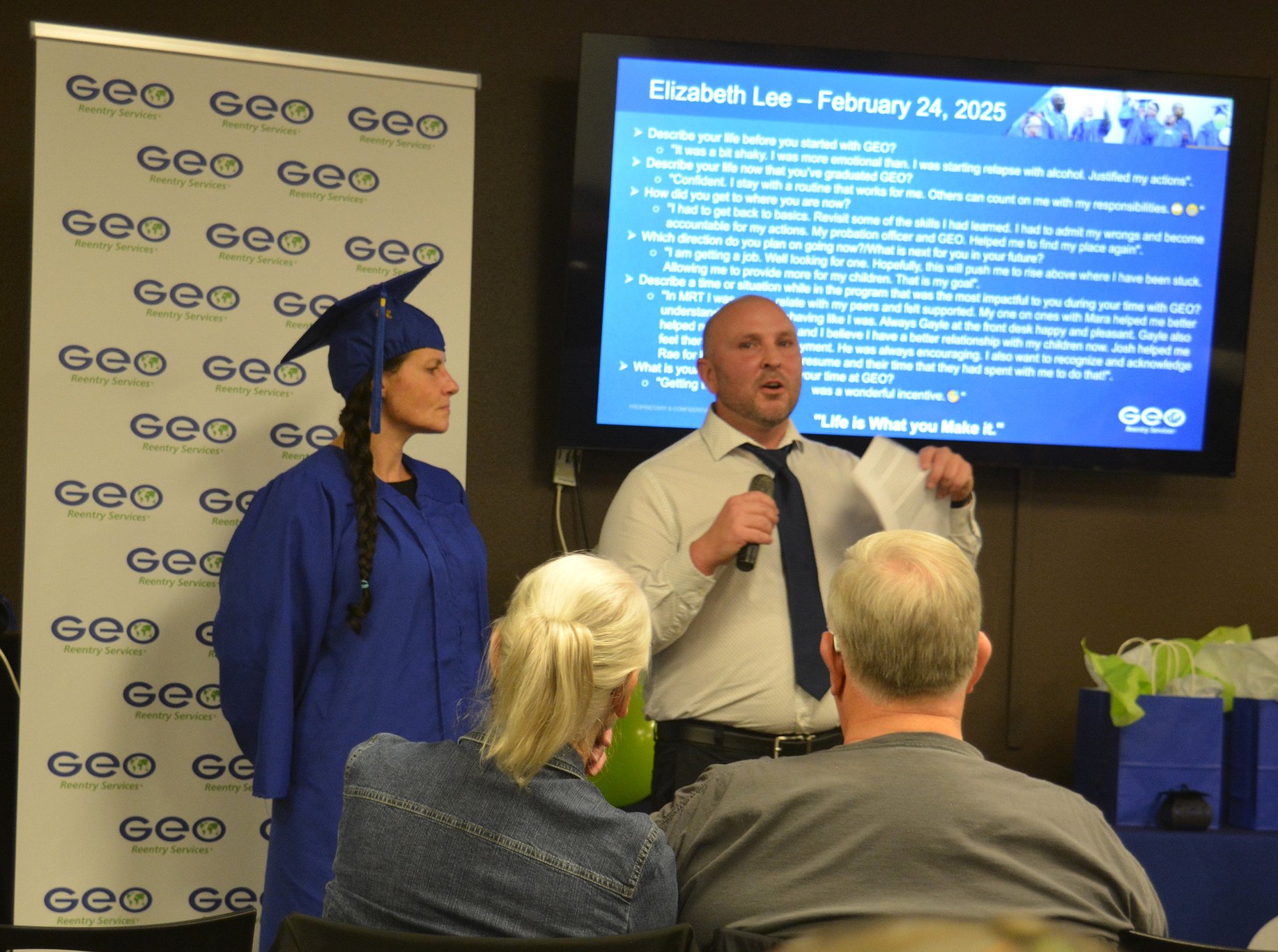 Douglas Miller commended about 20 graduates and their families on behalf of GEO Reentry Services for not only working on their sobriety, but also working toward healthier outcomes for themselves.