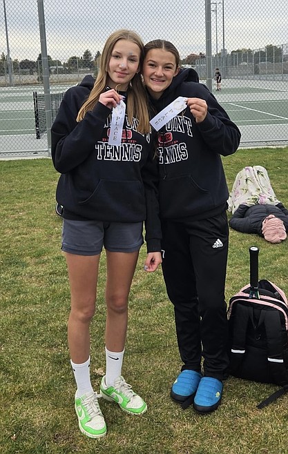 From left, Eva Jannsen and Myelle Jensen took third place overall at the district championship. competing in No. 1 doubles. The duo also won matches by scores of 6-0 and 6-2 during recent wins over Lake City and Coeur d'Alene. Zephyr Favazza, not pictured, also won matches by scores of 6-3 and 6-0 against the Timberwolves and Vikings and helped Sandpoint to a district team title with a second-place finish in No. 2 singles.