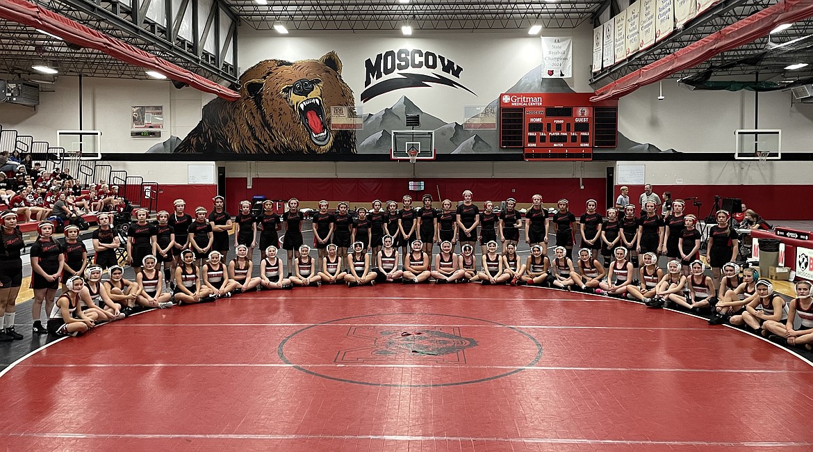 Full caption: The Sandpoint Middle School Lady Bullpup wrestling program recently kicked off their season at Moscow High's Bear Den. The match made history as the first-ever girls-only official middle school wrestling dual in the Inland Northwest. Pictured are both teams, Moscow in back and Sandpoint in front, before the dual kicked off. Between the two teams there were 61 participants — 33 sixth-through-eighth graders for the Lady Bears, which are coached by Matt Haley and Skyla Zimmerman, and 28 seventh-through-eighth graders for the Lady Bullpups, which are coached by Valerie and Andre Johansen. The energy in the gym was described as electric, with a large crowd supporting the fast-growing programs. Ultimately, the dual was scored by matches won, and Sandpoint earned 44 victories compared to Moscow's 27. "The real winner tonight was girls wrestling," SMS head coach Valerie Johansen said. "What we’re seeing isn’t just competition, it’s culture. North Idaho isn’t playing catch-up anymore; we’ve built belonging, belief, and a standard that’s here to stay.” It's safe to say both Sandpoint and Moscow are officially leading the charge in the rise of girls wrestling in the Inland Northwest.