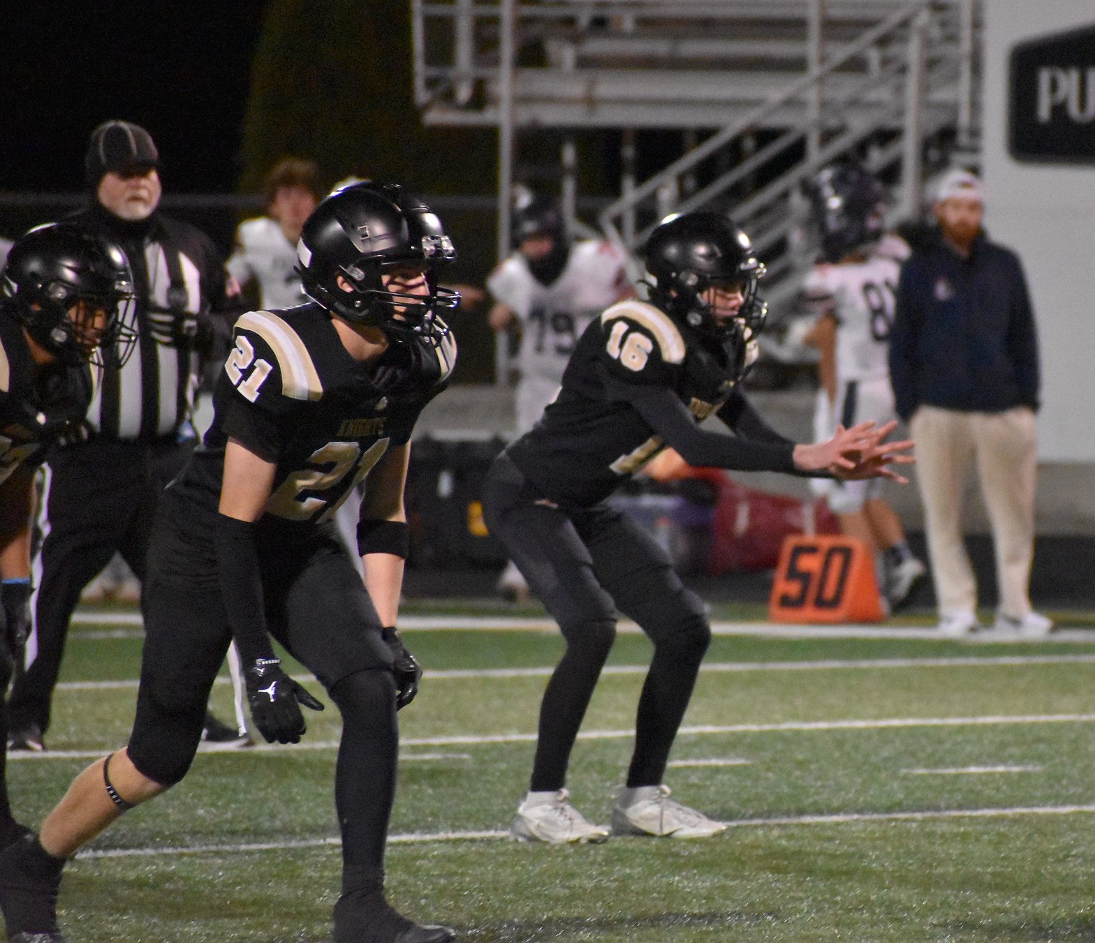 Scout Stevenson (21) from the Knights lines up for the start of the play while Brycen Fitzhugh (16) fills in at quarterback late in the game against King’s Way Christian. Stevenson said the team was very prepared for this week’s matchup and will continue to work toward their next opponent as the postseason progresses.ARTICLES BY CALEB PEREZ