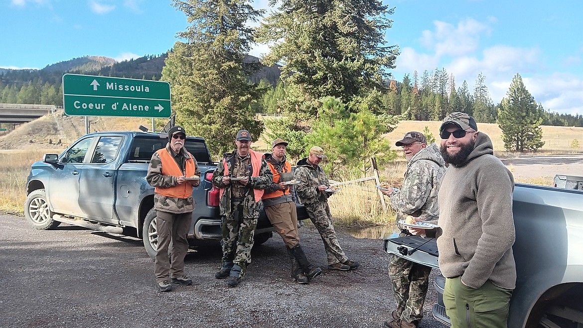 A group of Missoula hunters enjoy an apple pie that one of their wives made for them knowing they would need their nourishment attempting to fill the freezer. 2 had special mule deer permits for HD 202 that they hoped to fill in the afternoon hunt. “This break to strategize was badly needed”, one of them laughed.