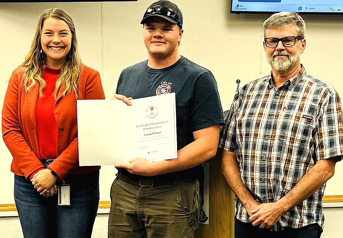 Representatives from the American Red Cross joined the Polson City Commission meeting on Monday, Nov. 3, to award Polson firefighter Casen Elmore the National Lifesaving Award for his quick action while off duty.