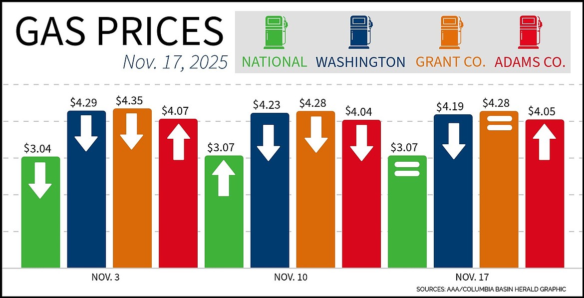 MOSES LAKE – On Nov. 17, gas prices saw a slight decrease in Washington. However, prices remained the same as the previous week in both Grant County and nationally. Adams County had a slight increase this week.