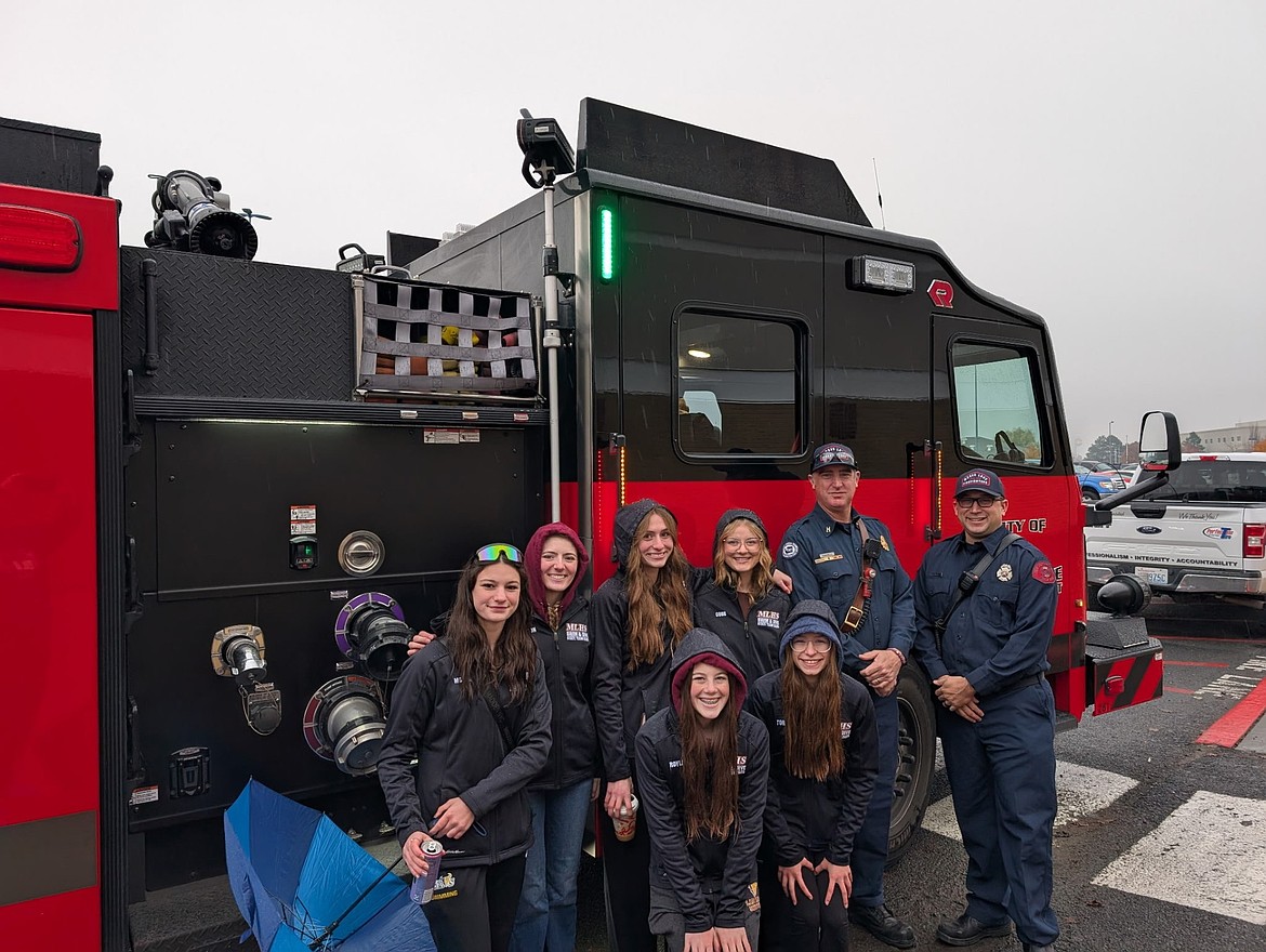 The Mavericks’ Taylor McKay, Ava Robinson, Dallie Cobb, Bria Bodenman, Kimball Roylance and Paysyn Torrey stand with two Moses Lake Fire Fighters during the team’s state sendoff. Head Coach Tony Preston said the seniors on the team are leaving behind a legacy of both being competitive while also being team players.