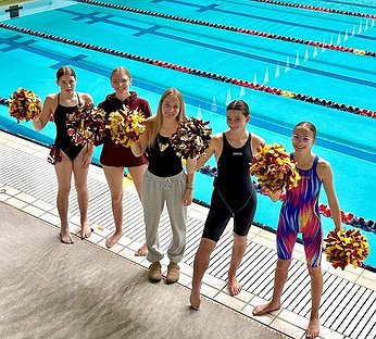 Kimball Roylance, Ava Robinson, Clara Larkin, Taylor McKay and Paysyn Torrey from the Mavs stand along the pool at the state championships with pom-poms in hand. Head Coach Tony Preston said the team camaraderie that was built throughout this season was one of their greatest strengths as they competed.ARTICLES BY CALEB PEREZ