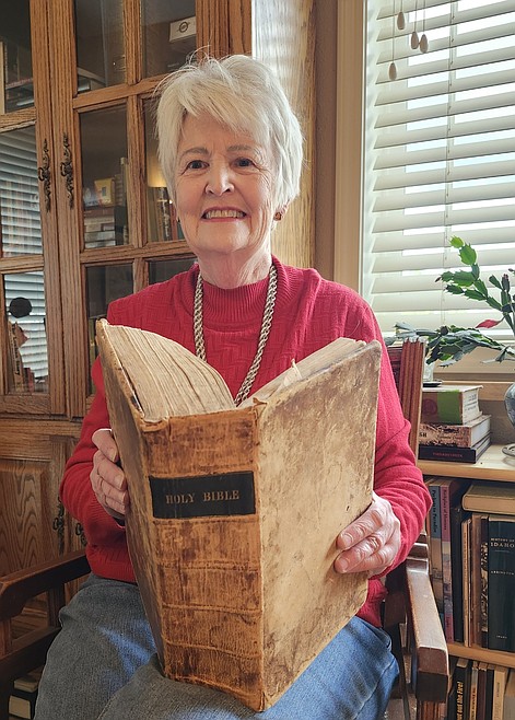 Debbie Mitchell, the great-great-granddaughter of Civil War soldier Joseph A. Phillips, is seen Friday with the Phillips Family Bible. The first entry in the book documents the wedding of Phillips and his bride, Harriet Campbell. Joseph Phillips is interred at Mica Peak Cemetery, where efforts are being made to install an official military marker on his gravesite as well as World War I veteran Elmer Jess.ARTICLES BY DEVIN WEEKS