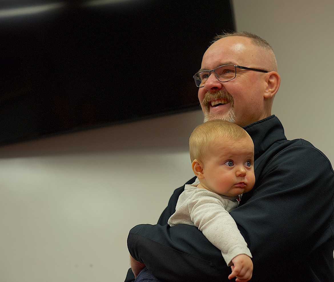 The chief, his youngest grandchild in his arms, swiped at a tear, before crediting his supportive family and his coworkers for his long career, which began in 2000 as a reserve deputy and ended Nov. 6 as fire chief.