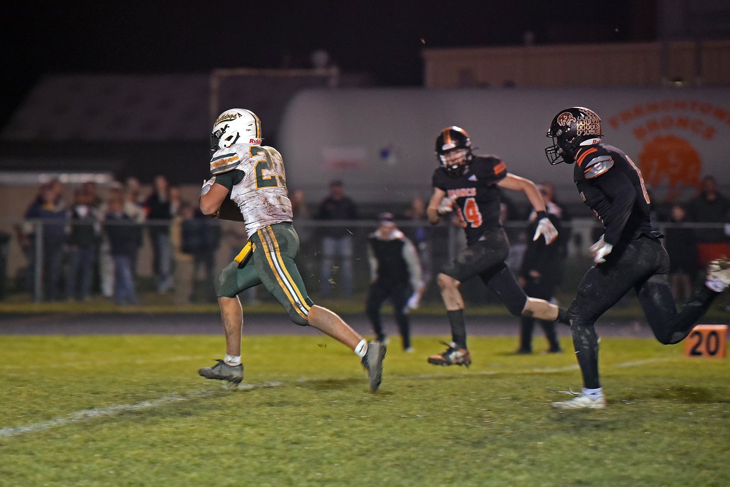 The fourth quarter brought a bit of tension. Frenchtown running back Cole Johnson converted on fourth-and-2 from the 12-yard-line and dodged a tackle before getting into some trouble that would lead to his ejection from the game. Right after, the Bulldogs also had a personal foul, putting the Broncs at first down at the Bulldog 24.