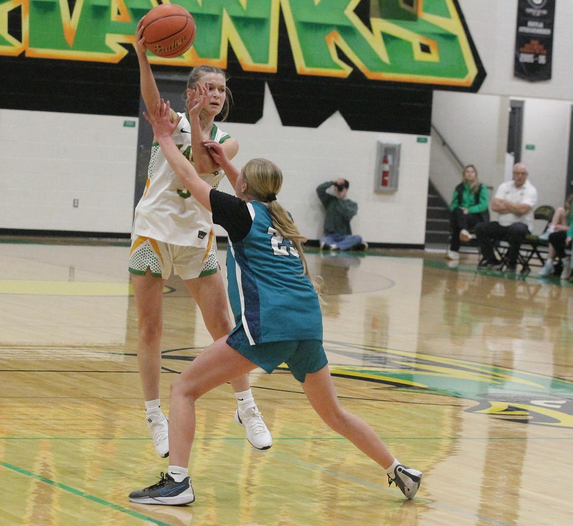Junior Macy Bretveld added nine points for the Hawks, who outscored the Timberwolves 20-7 in the second quarter, and held the visitors to four points in the third quarter.