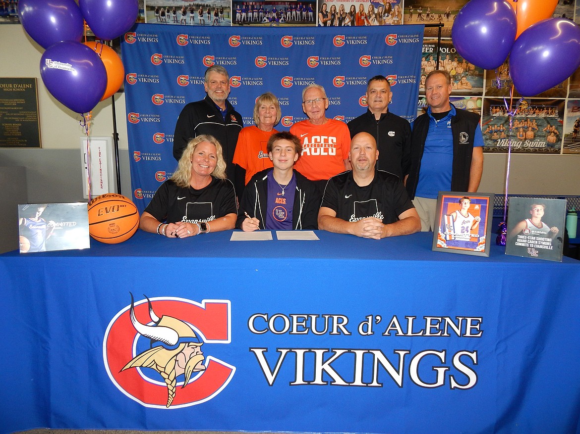 Courtesy photo Coeur d'Alene High senior Caden Symons recently signed a letter of intent to play basketball at the University of Evansville. Seated from left are Nicole Symons (mom), Caden Symons and Corey Symons (dad); and standing from left, John Naccarato (Coeur d'Alene High assistant boys basketball coach), Cindy Nipp (grandmother), Dave Nipp (grandfather), Kent Leiss (Coeur d'Alene High head boys basketball coach); and Tony Prka (Coeur d'Alene High athletic director).