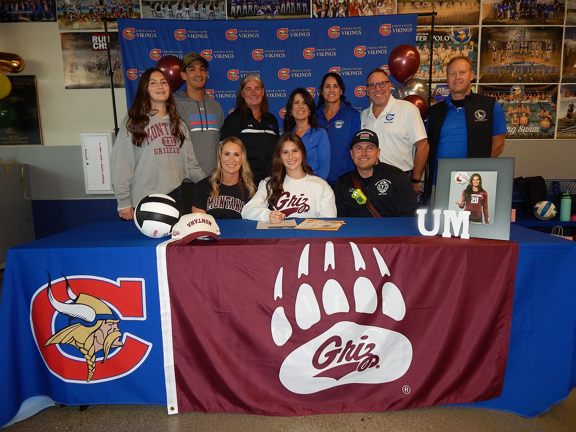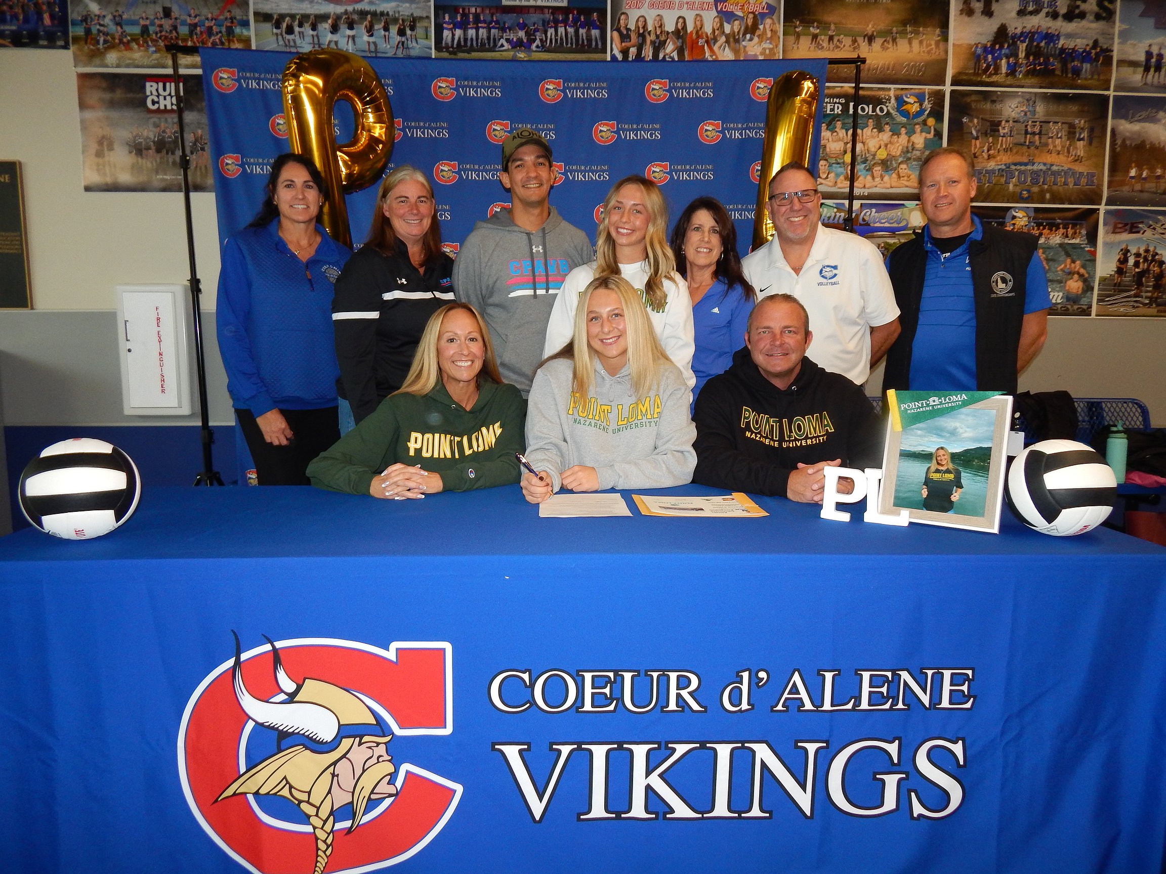 Courtesy photo Coeur d'Alene High senior Gianna Callari recently signed a letter of intent to play volleyball at NCAA Division II Point Loma Nazarene University in San Diego. Seated from left are Michelina Callari (mom), Gianna Callari and Anthony Callari (dad); and standing from left, Carly Curtis, Coeur d'Alene High head volleyball coach; Jill Benson, club volleyball coach; Drew Pascua, club volleyball coach; Eva Callari, sister; Joyce Nida, Coeur d'Alene High assistant volleyball coach; Kevin Curtis, Coeur d'Alene High assistant volleyball coach; and Tony Prka, Coeur d'Alene High athletic director.