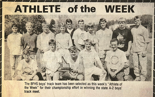 The 1990 Bonners Ferry High boys track & field team captured the school’s first state title since 1975, when the football and track & field teams both won state championships. That season, out of 146 possible points in a dual meet, the Badgers scored at least 117 points in every meet, outscoring league opponents Lakeland, Kellogg, Priest River, Wallace, and St. Maries by a differential of 489 to 97. At the district championship meet, they dominated once again, winning by more than 100 points. At the state championship meet, Ed Cowin led the Badgers by winning the 3200-meter run with a time of 9 minutes, 55.8 seconds, which ultimately helped drive a balanced Badger attack that secured the A-2 State Championship title.