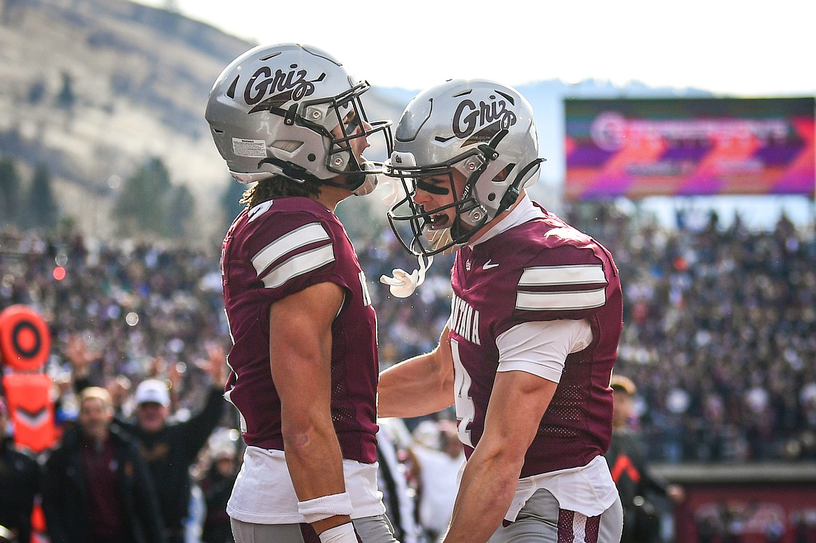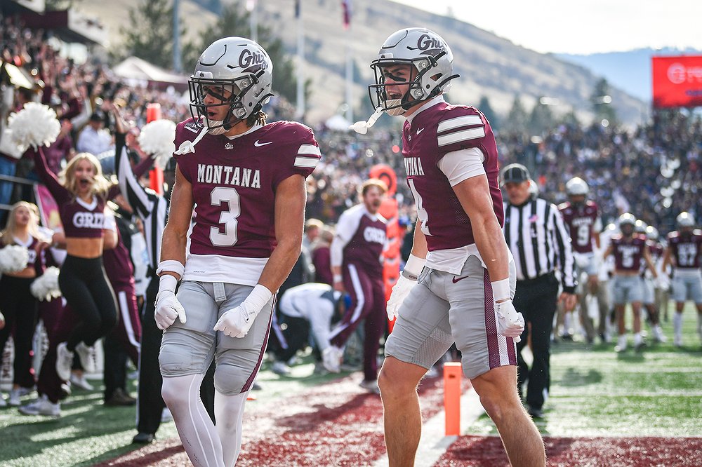 Grizzlies wide receivers Brooks Davis (3) and Blake Bohannon (4) celebrate after Brooks' 14-yard touchdown reception in the first quarter against Montana State in the 124th Brawl of the Wild at Washington-Grizzly Stadium on Saturday, Nov. 22. (Casey Kreider/Daily Inter Lake)