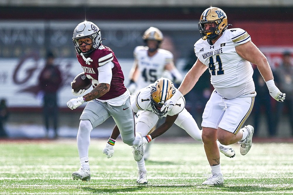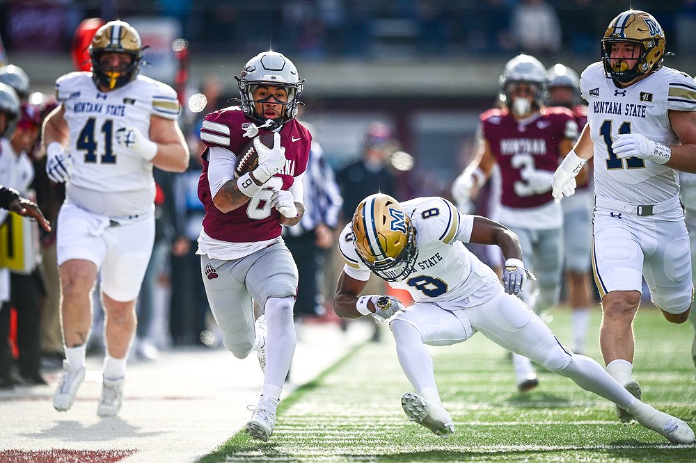 Grizzlies wide receiver Michael Wortham (6) picks up a 35-yard gain on a run in the first quarter against Montana State in the 124th Brawl of the Wild at Washington-Grizzly Stadium on Saturday, Nov. 22. (Casey Kreider/Daily Inter Lake) Casey Kreider