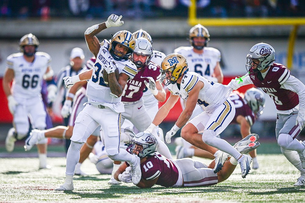 Bobcats running back Julius Davis (32) evades a tackle on a run in the second quarter against Montana in the 124th Brawl of the Wild at Washington-Grizzly Stadium on Saturday, Nov. 22. (Casey Kreider/Daily Inter Lake)