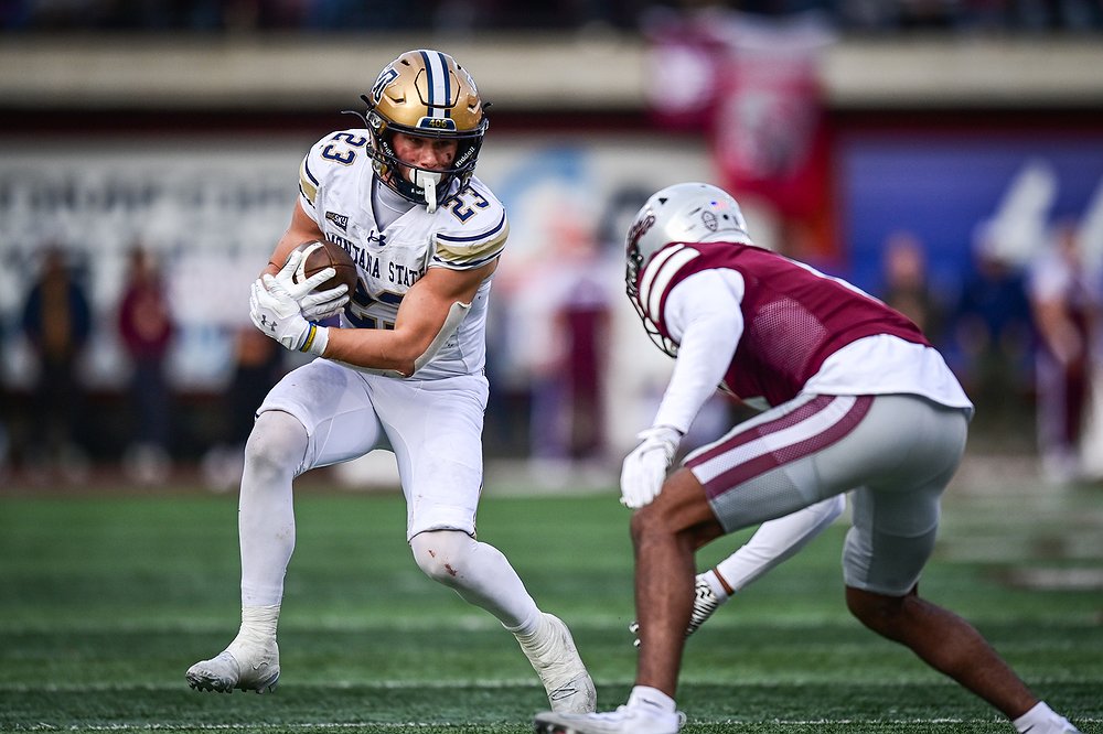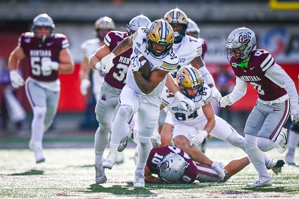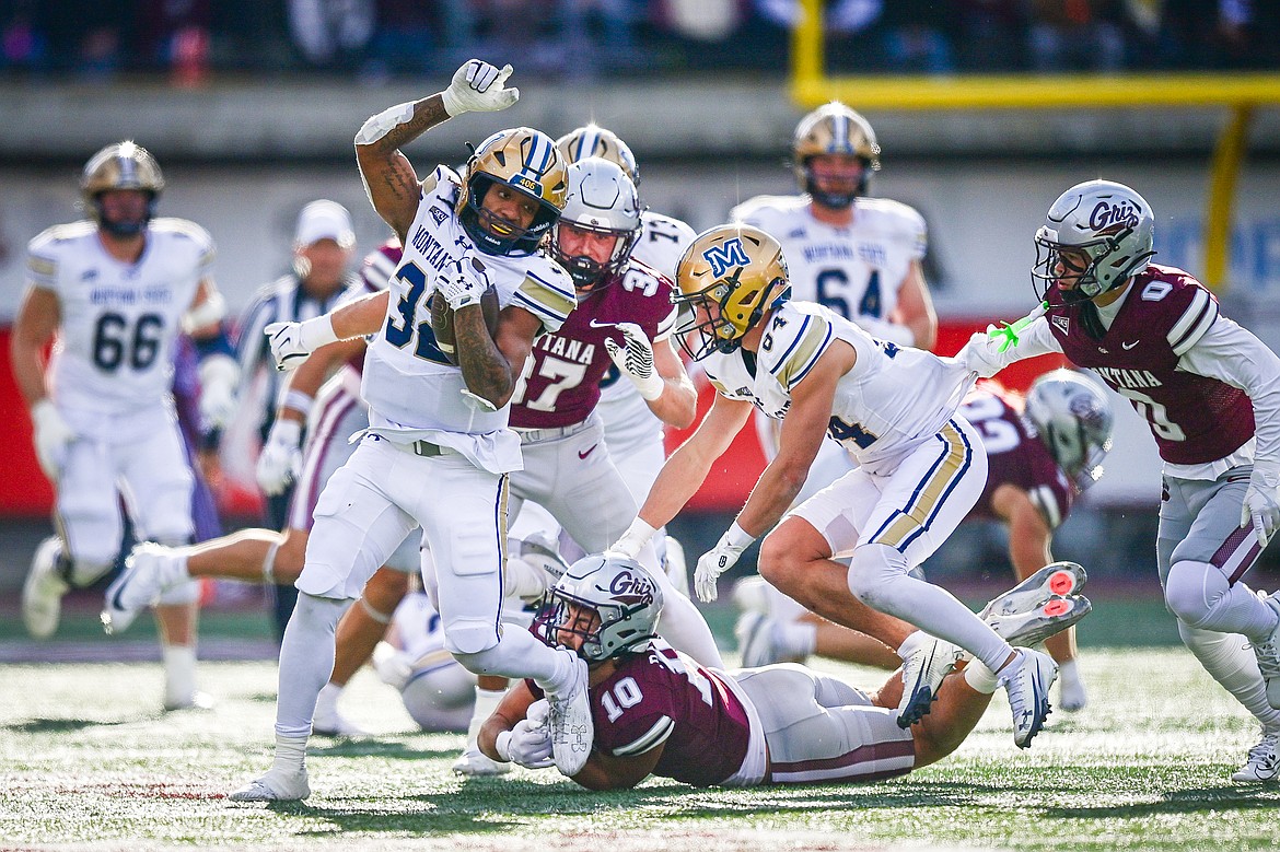 Bobcats running back Adam Jones (23) picks up yardage on a run in the fourth quarter against Montana in the 124th Brawl of the Wild at Washington-Grizzly Stadium on Saturday, Nov. 22. (Casey Kreider/Daily Inter Lake) Casey Kreider