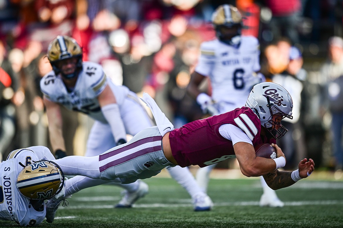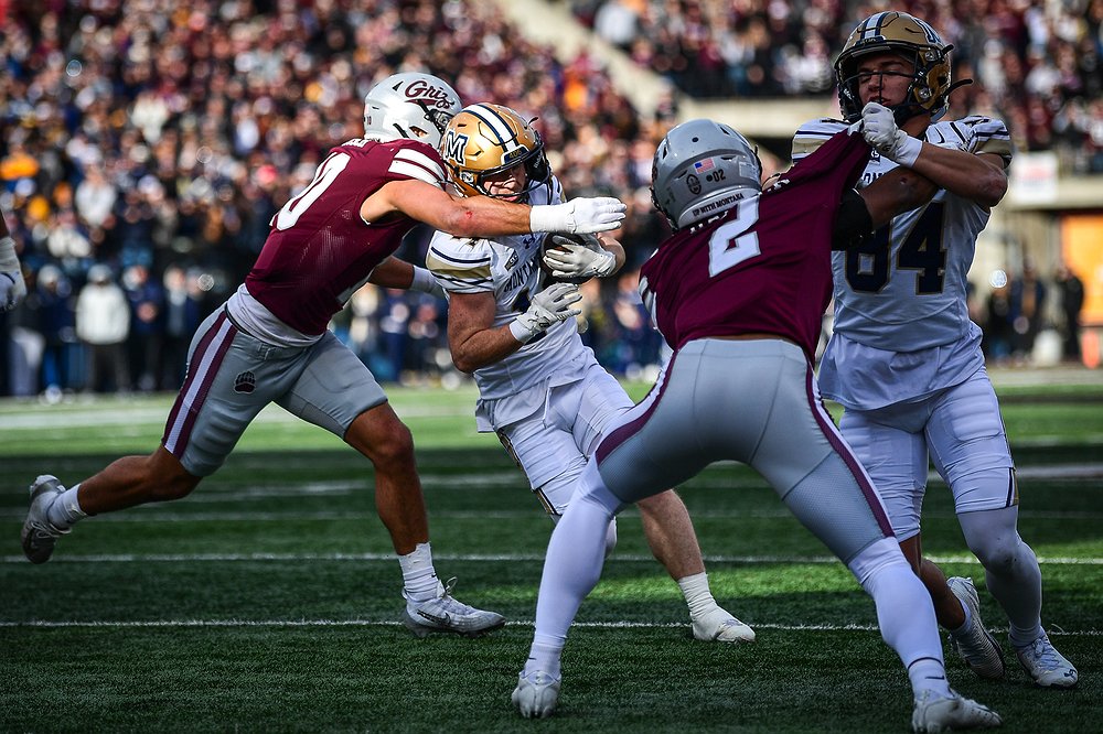 Bobcats wide receiver Taco Dowler (14) is tackled by Grizzlies defensive lineman Jareb Ramos (90) on a run in the first quarter in the 124th Brawl of the Wild at Washington-Grizzly Stadium on Saturday, Nov. 22. (Casey Kreider/Daily Inter Lake)